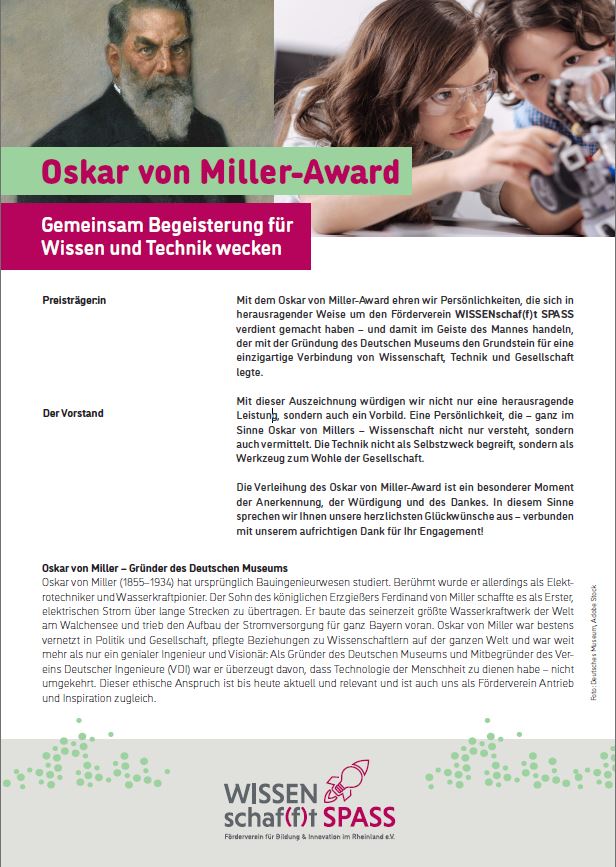 Er ist die höchste Auszeichnung des Fördervereins für seine Unterstützer: Mit dem Oskar von Miller-Award ehrt WISSENschaf(f)t SPASS Persönlichkeiten, die sich in herausragender Weise um den Förderverein verdient gemacht haben und damit im Geiste des Mannes handeln, der mit der Gründung des Deutschen Museums den Grundstein für eine einzigartige Verbindung von Wissenschaft, Technik und Gesellschaft legte.