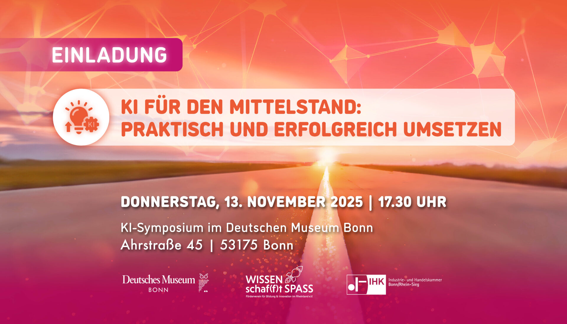 Die Veranstaltung wird gemeinsam organisiert von WISSENschaf(f)t SPASS und der IHK Bonn/Rhein-Sieg und richtet sich insbesondere an Unternehmer:innen und mittelständische Unternehmen aus dem Rheinland. Das Ziel dieser Veranstaltung ist es, einen Einstieg in das Thema KI für den Mittelstand zu bieten, Beispiele aus der Praxis kennenzulernen, Erfahrungen auszutauschen und Orientierung zu geben. Und wo geht das besser als im Deutschen Museum Bonn – dem Forum für Künstliche Intelligenz!