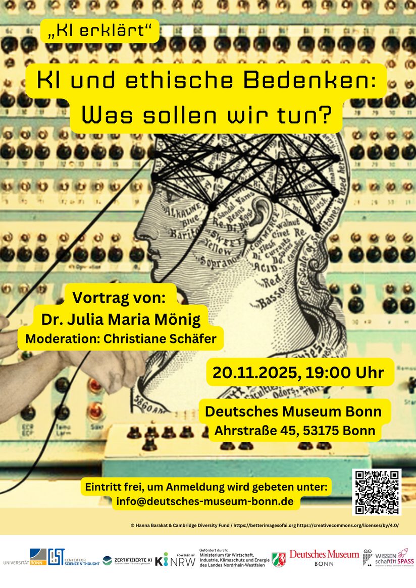 Vortrag von Dr. Julia Maria Mönig, Leiterin des philosophischen Teilprojektes im KI.NRW-Flagship-Projekt “Zertifizierte KI” an der Universität Bonn mit anschließender Diskussion im Rahmen der Veranstaltungsreihe “KI erklärt” im Deutschen Museum Bonn.
